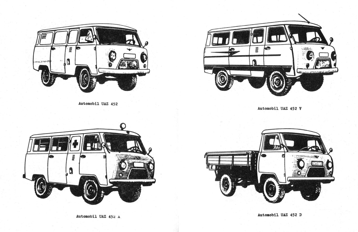 A series of early design variants for the UAZ-452. Included (clockwise from top left) are the stan- dard van, microbus, ubiquitous farmers truck, and legendary ambulance.