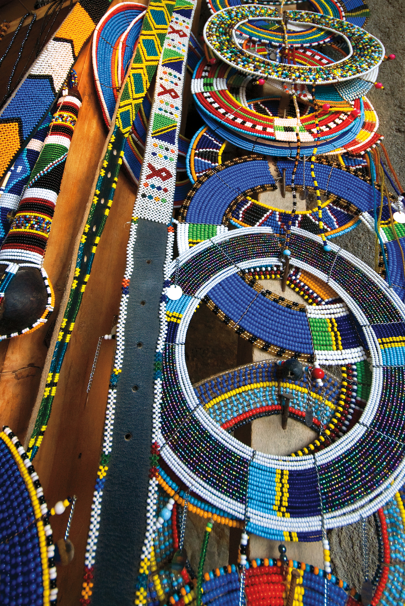 Both men and women wear jewelry in the Maasai tribes; the beadwork tradition is passed down by the women to each new generation. the colors and designs have symbolic meanings indicating social status, age, marital status, and even whether a woman has given birth to a boy or girl. a visit to an authentic village is worth it, rather than a tourist curio shop.