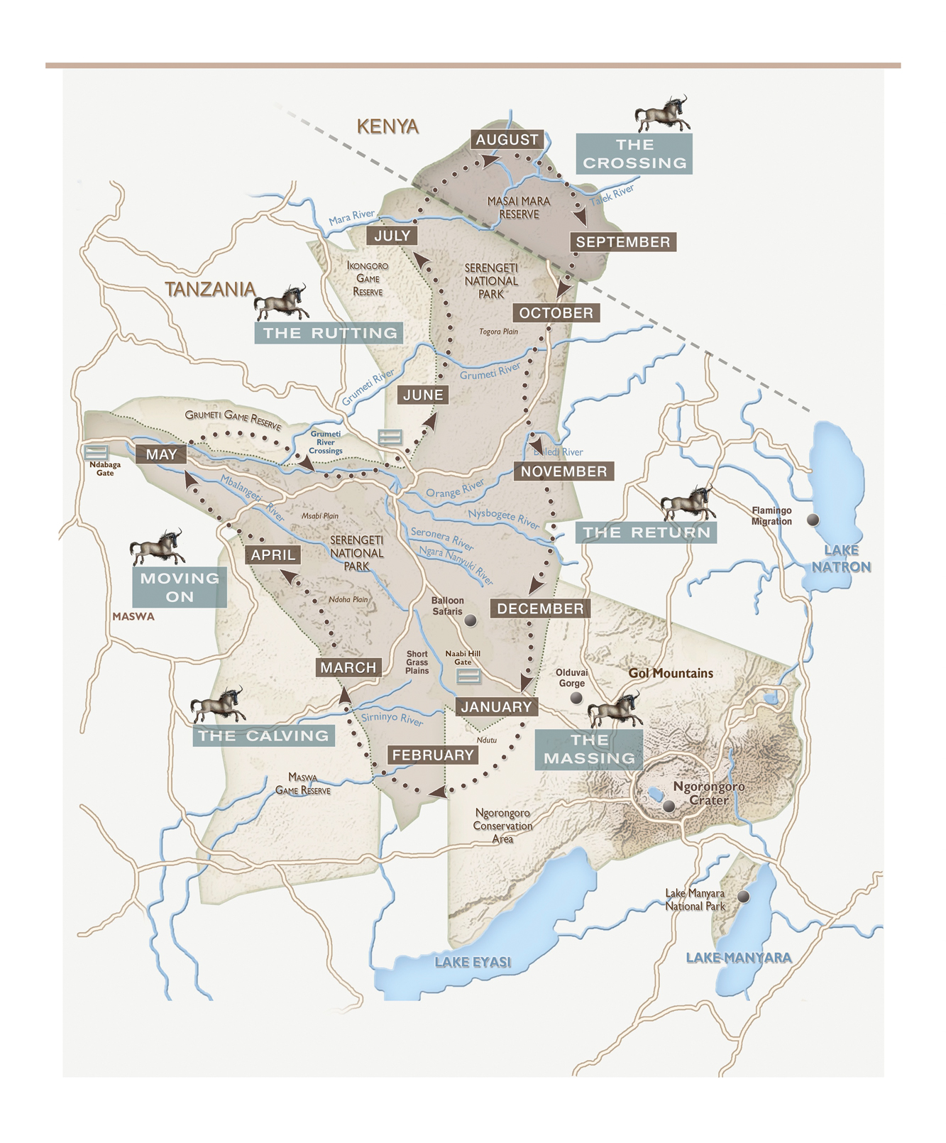 Though actual timing is dependent upon the rains, up to two million wildebeest follow this annual migration pattern each year.