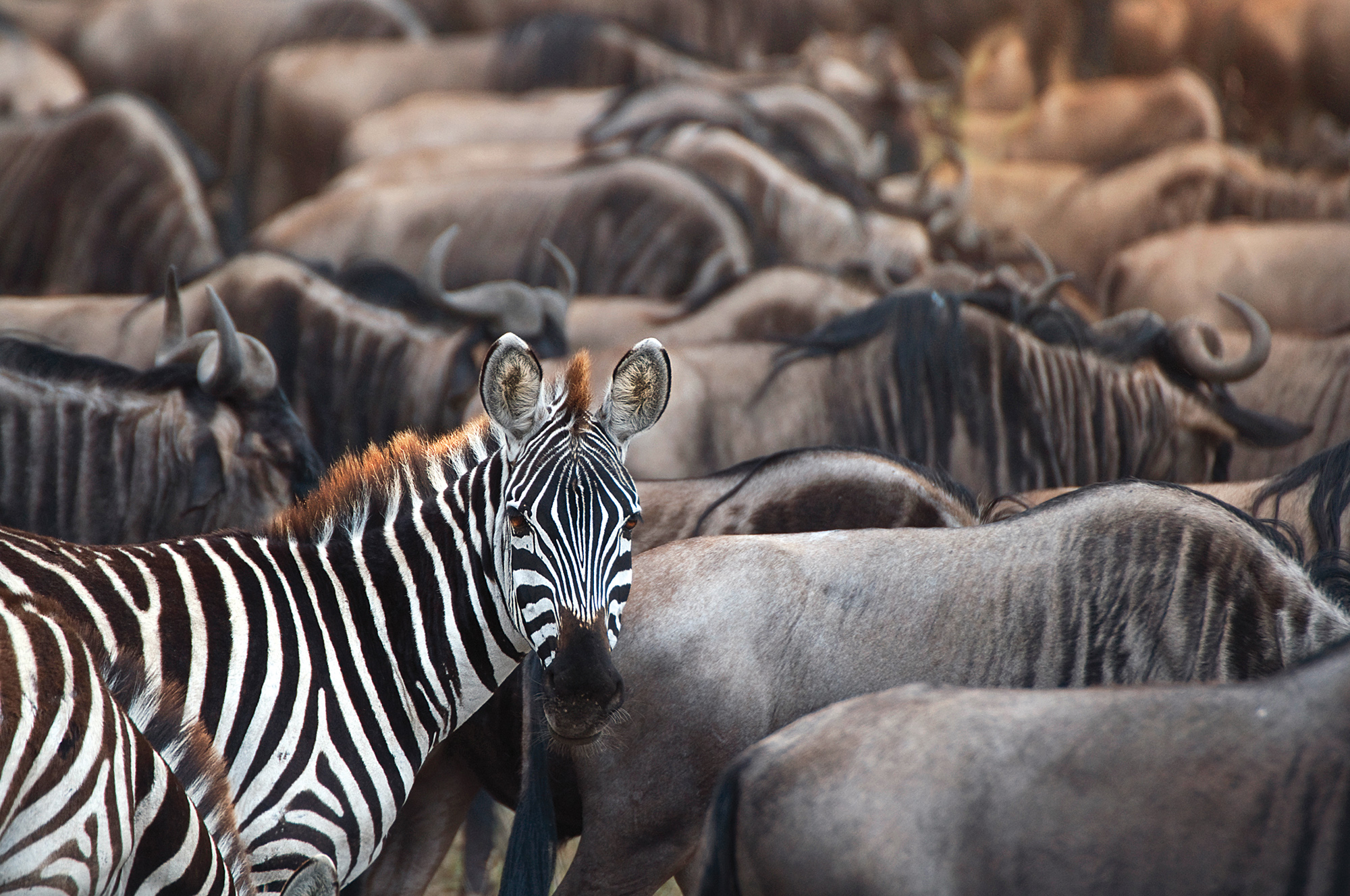 These two species can travel together as there is no competition for food; they eat the same grass but different parts. The zebra eat the taller grass while the wildebeest prefer the shorter—a symbiotic relationship.