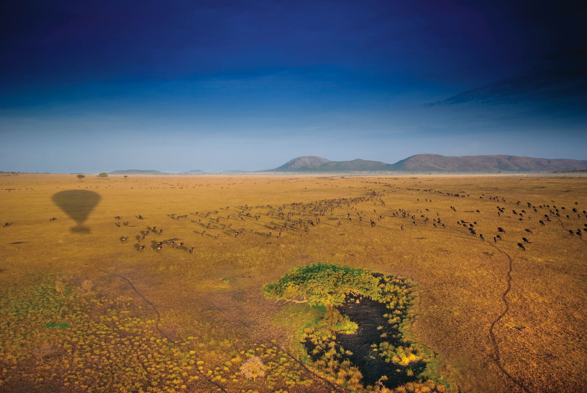 Floating effortlessly above the magnificent vista in the early morning gives an inkling of the magnitude and beauty of the Serengeti. wildebeest herds scattered below, painting long shadows in the light, confirming why this natural wonder needs preservation.
