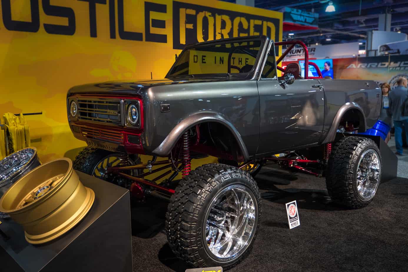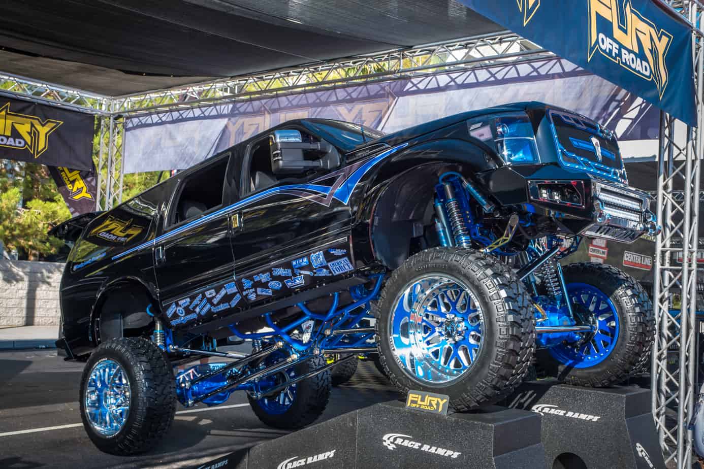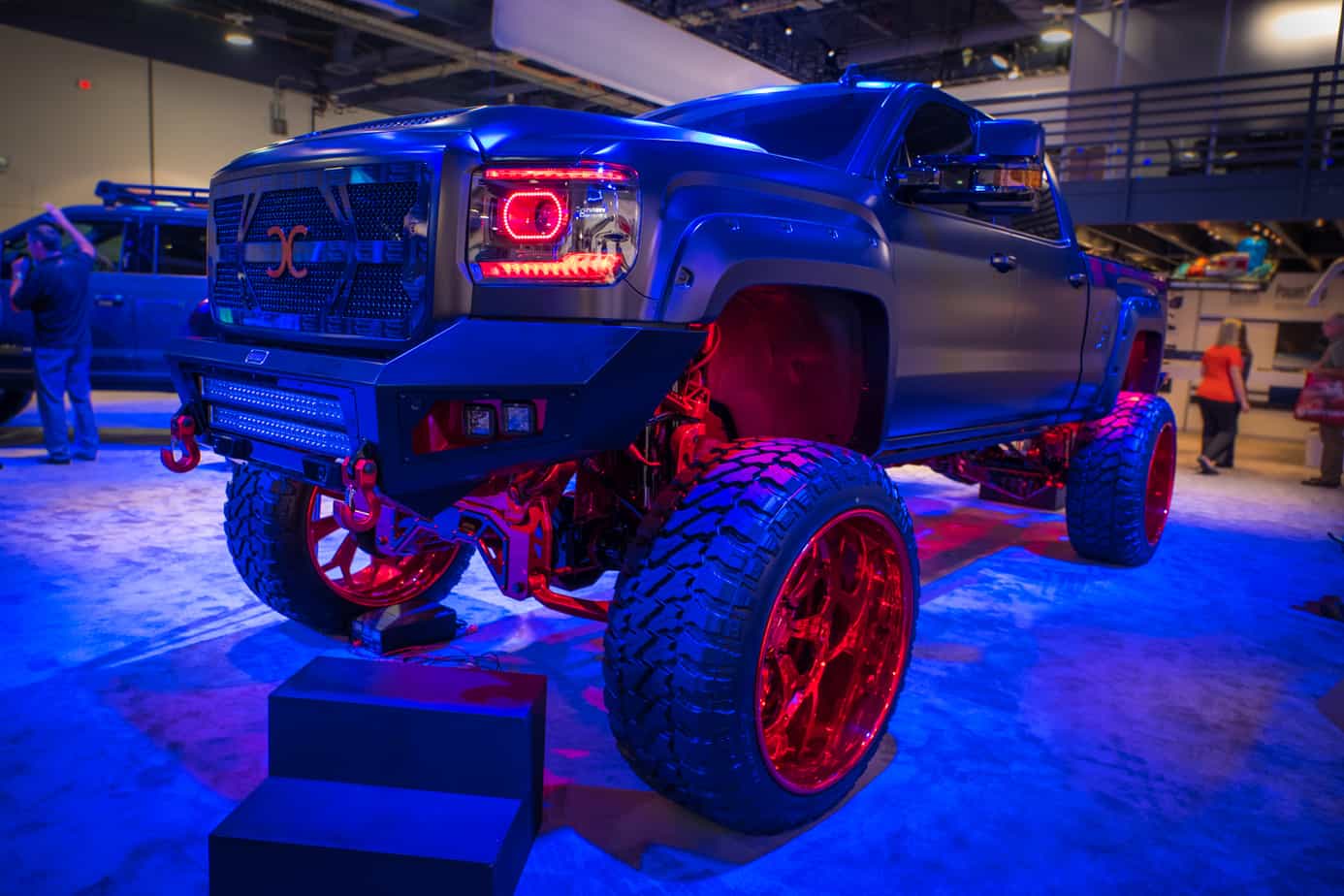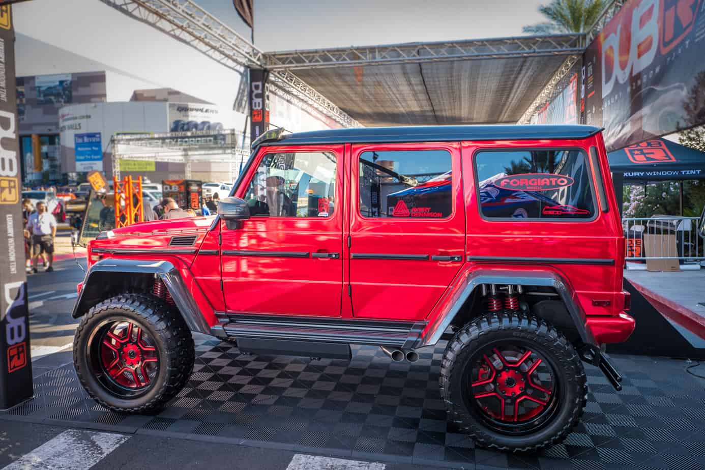 There’s no shortage of lifted trucks at SEMA, but this was one of the craziest ones we saw. The red chrome wheels, red LED headlights, and red rock lights were over the top, but the addition of blue overhead lighting just made the entire booth feel a little sickly.