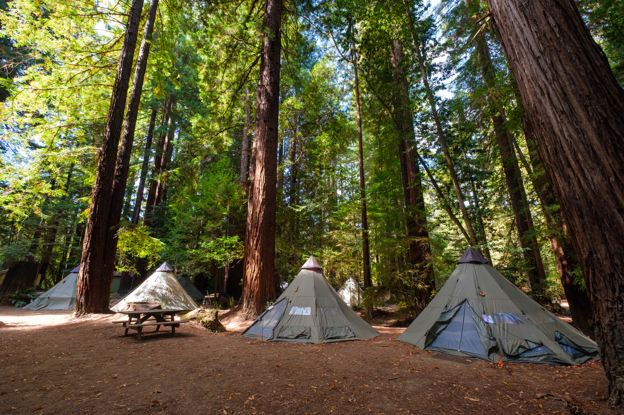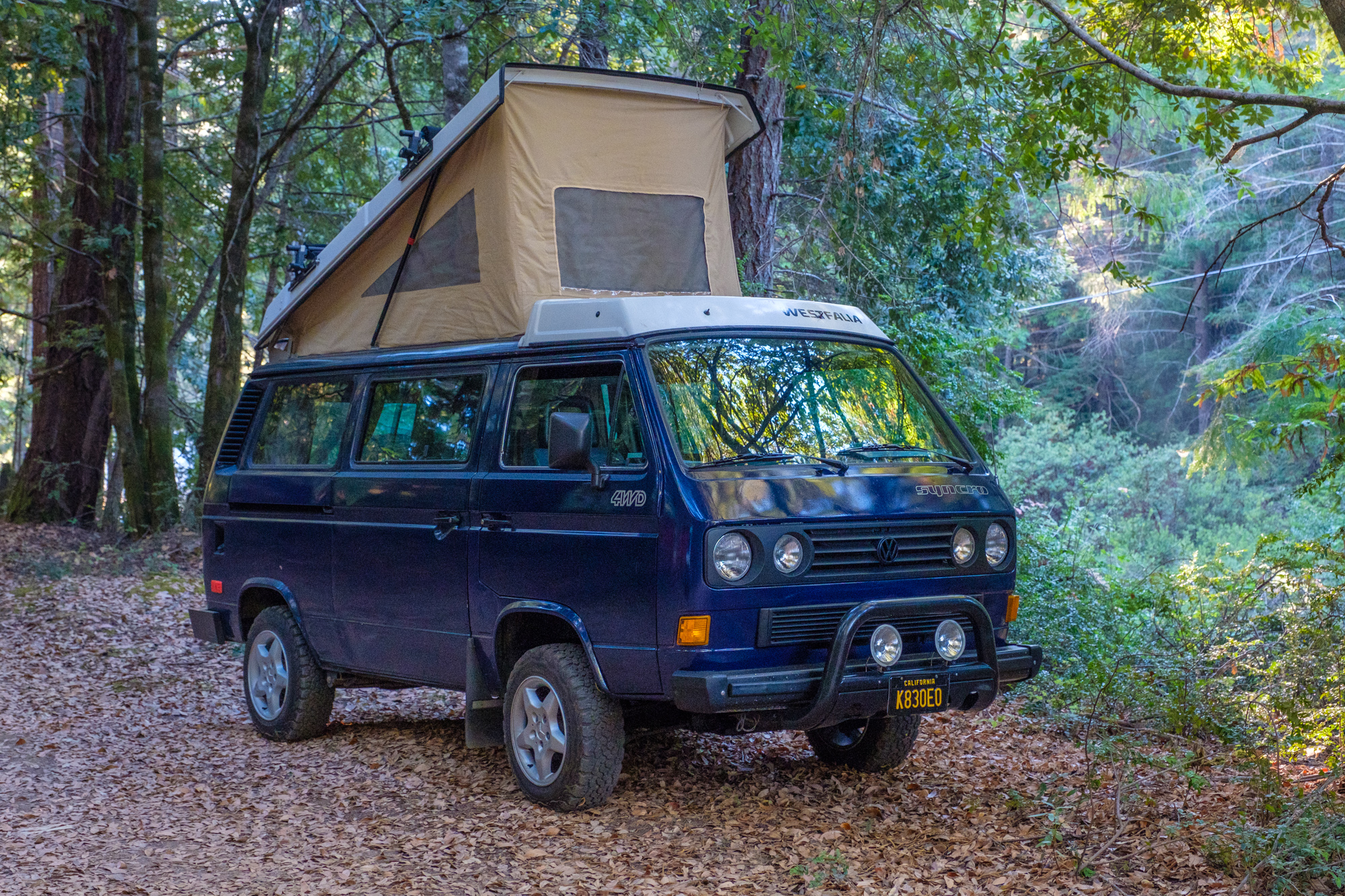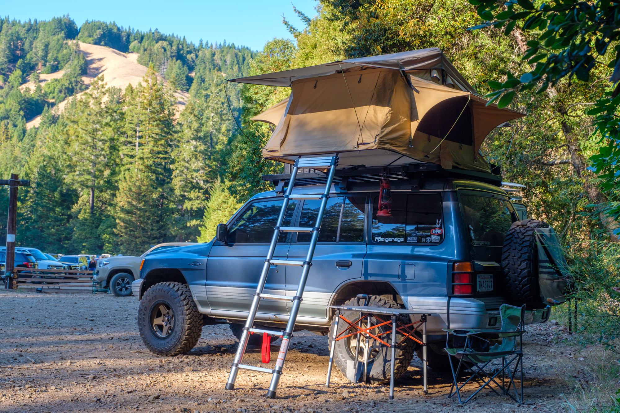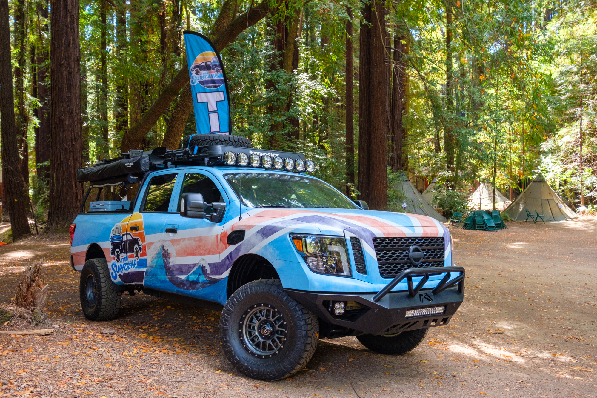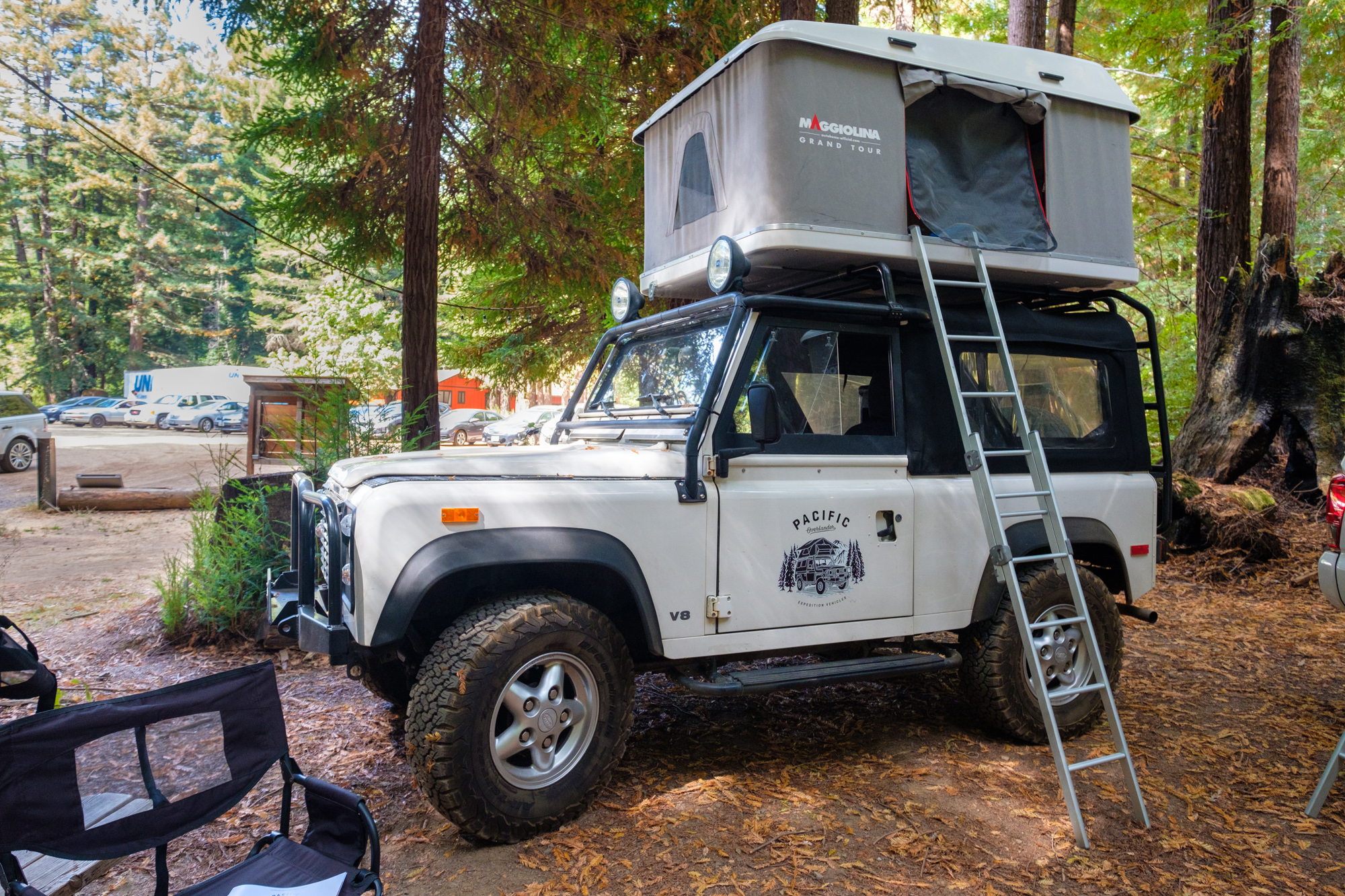 Just 10 feet away from Nissan’s Surf Camp we stumbled into Pacific Overlander, a rental company based in San Francisco. They have a range of ready to roll overland trucks and SUVs for reasonable rates in the Pacific Northwest, and even offer one-way rentals to various cities and airports. Their Tacoma and Defender 90 were tucked neatly between the redwoods on display, but they also rent 4Runners and Jeep JLs, all of which come fully stocked with gear.