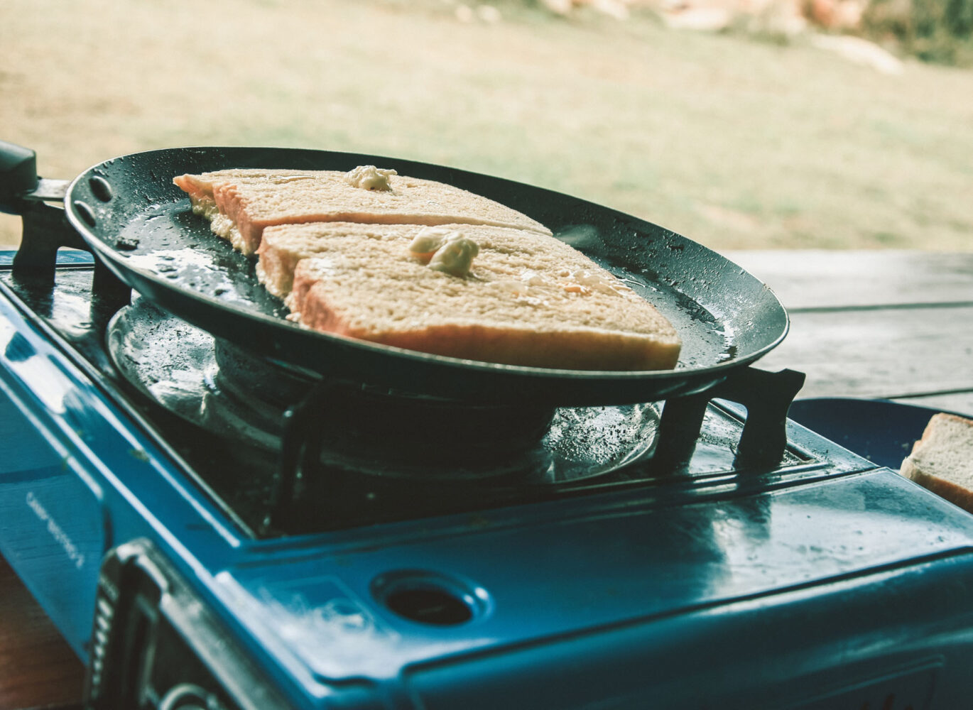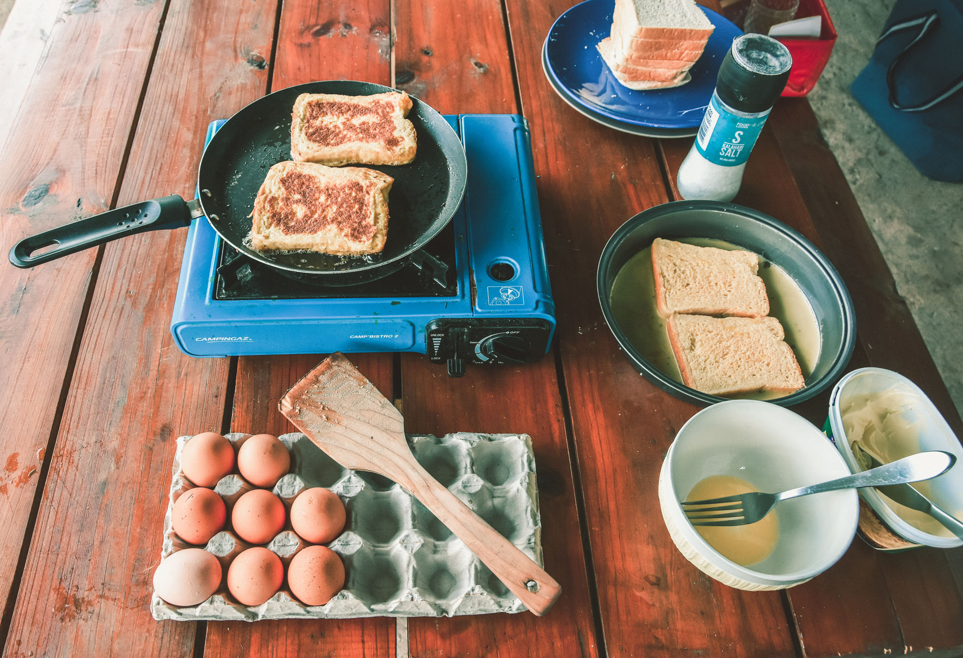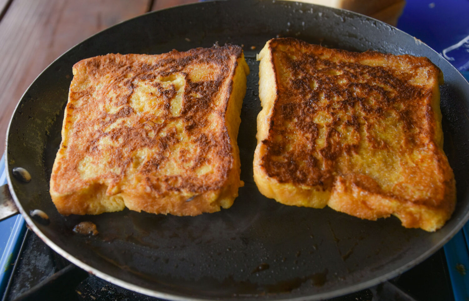 For a grand total of $0.35 (less cooking gas) per slice, a family breakfast for four eating two slices each will cost the grand sum of $2.73. Long-term, long-distance overland travelers count pennies and love a good value meal. But that is a basic slice of buttered French toast. You can take it to the next level by adding strawberries and blueberries, syrup and cream cheese, bacon and syrup, figs and goat cheese, banana and dark chocolate, cinnamon, etc. We don’t. The boys have their slices with fat blobs of salted butter, and the girls eat theirs with maple syrup—simple.