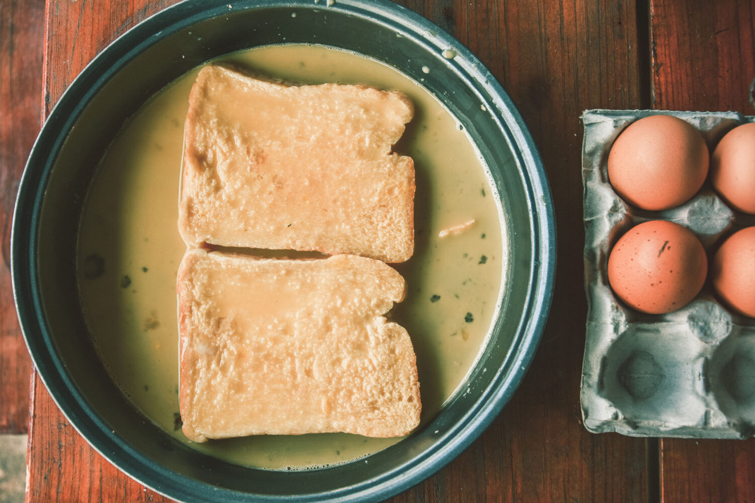 - Pour the mix into the soaking dish; any dish which can accommodate at least two slices will do. Soak the first two slices for a few minutes and flip until the bread is soaked through.