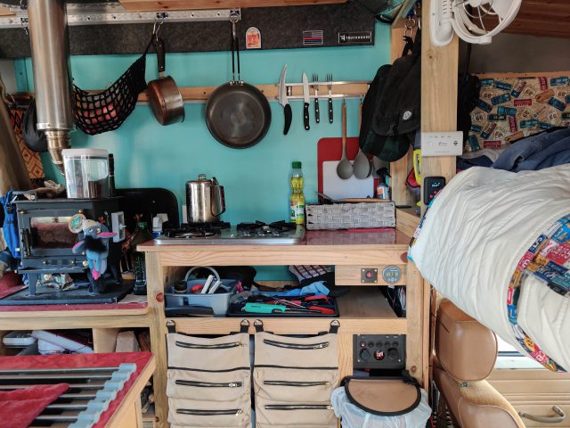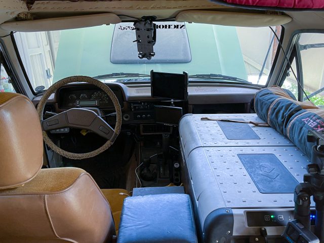 A common mistake in vehicle builds is to overload the vehicle with attractive but heavy wood flooring and furniture, unnecessary luxuries, and piles of gear. Simple is superior when outfitting a camper, and the greatest luxury in a small camper is space. Brad was naturally very concerned with weight, and all the cabinetry is lightweight pine and cedar. The vehicle is further insulated by the Warm Window insulated shade system and curtains. Brad plans to spend time traveling to colder climates and has installed a Grizzly Cubic mini wood stove and a diesel heater, making him the envy of all overlanders everywhere he goes. Multi-talented Brad did all the welding, woodwork, fiberglass, conversions, and sewing. A warm, cozy nest was beginning to take shape, but there were still a few modifications to be made, dragging the 40-year-old vehicle into the present.