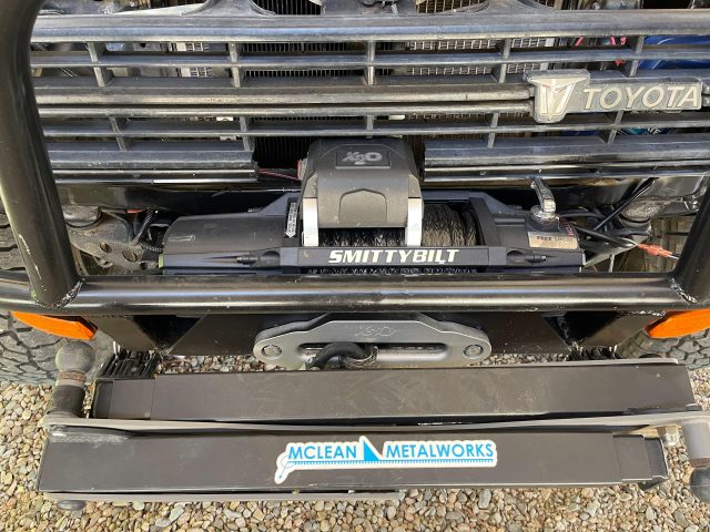 The retrofit continued with a solid axle swap, an IFS hub conversion, and a wise upgrade to Tundra brakes and calipers to handle the 33-inch Wildpeak AT3W tires, with a planned upgrade to Method grip lock wheels for safer air downs on this heavy rig. Gears are 4:56 with a high pinion limited slip in front and an E-locker in the rear. The suspension setup consists of effective custom Alcan springs and Fox smooth body reservoir shocks with custom valving and progressive SumoSprings for the rear. A modified Hellwig 2500 HD Ram sway bar cancels any body roll. For recovery, Brad equipped the blue beauty with a SmittyBilt winch, GoTreads (which he also uses for leveling), and a kinetic rope.