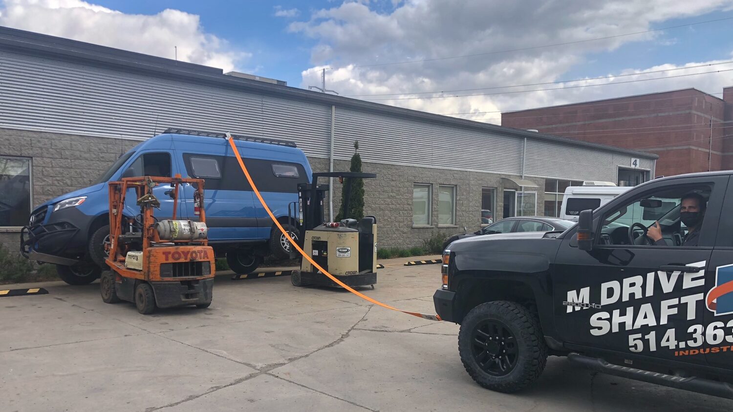My resourceful friend had two lifts ready, one for each driver’s side wheel. We strapped the sturdy roof to his pickup truck and then parked the van close enough to a wall so that if everything went wrong, I might only have the awning to replace.