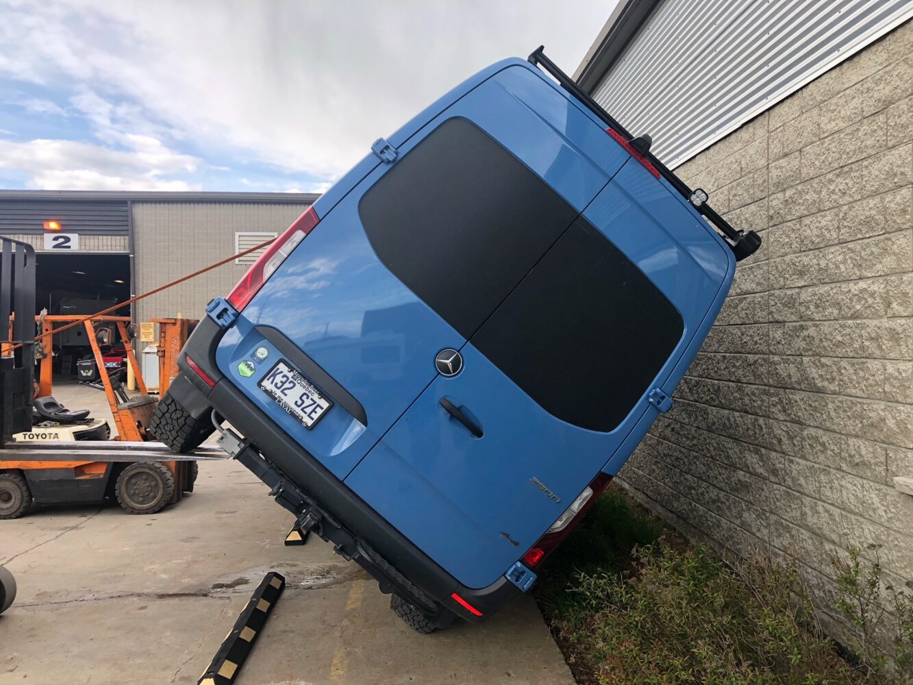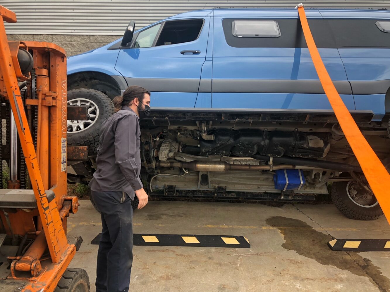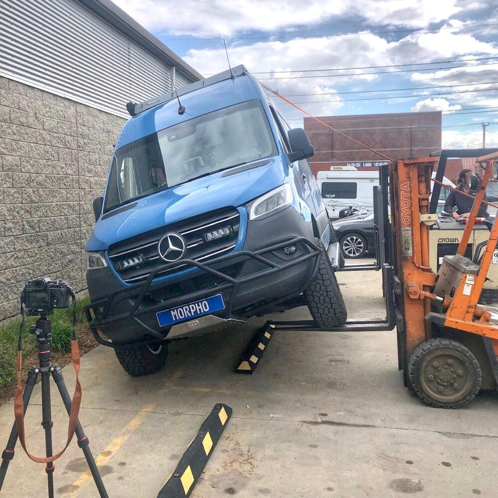 With both driver’s side wheels on the forks, we slowly lifted and lifted. At 30 degrees, we tried to lift the upper side by hand. It didn’t move, gave a little more, and then more and more. Even with the van fully packed from the last weekend’s road trip with an upper cabinet full of stuff, a 30-gallon water tank, a fridge, and a heavy electric awning on the side, we reached 43 degrees before it became light on the forks of the lift. At 45 degrees, I could move the van by hand on one side or the other.