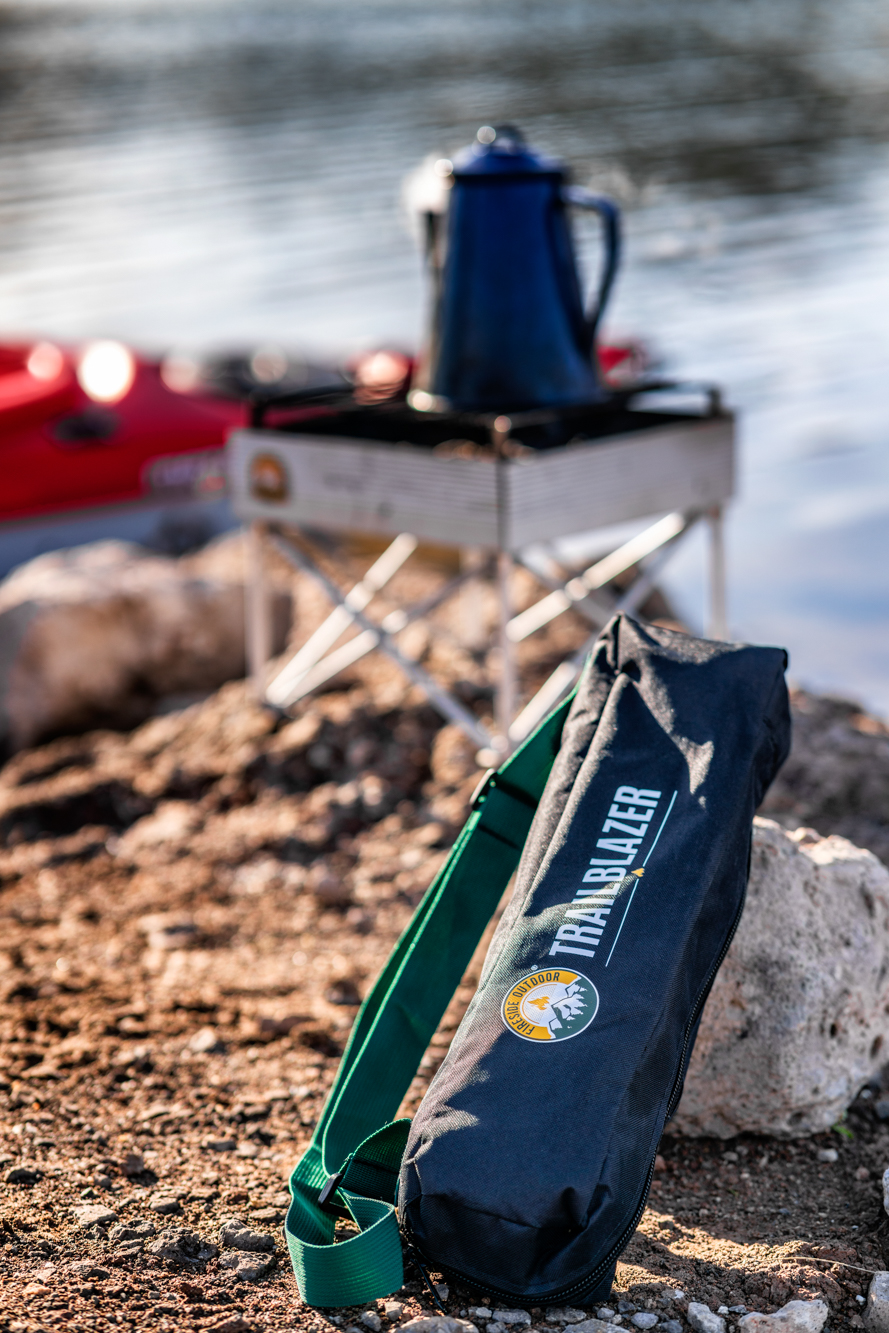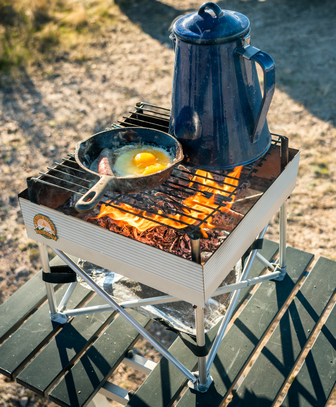 The Trailblazer is a collapsible aluminum fire pan that helps reduce your impact on the environment by lifting your fire off the ground and burning its contents to a fine ash that can be easily dispersed. It requires no hardware or tools to set up, and packs down to 14 x 4 x 4 inches or about the size of a standard camera tripod or Stanley Thermos. When open, it stands 11 inches tall and provides a 12- x 12-inch burn area made from a tight wire net they call fire mesh. This mesh not only makes the fire easier to light, but also helps it burn hotter, brighter, and with less smoke due to the airflow from underneath the pit. Below this mesh is a reflective heat shield to prevent any embers or radiating heat from scarring the ground.