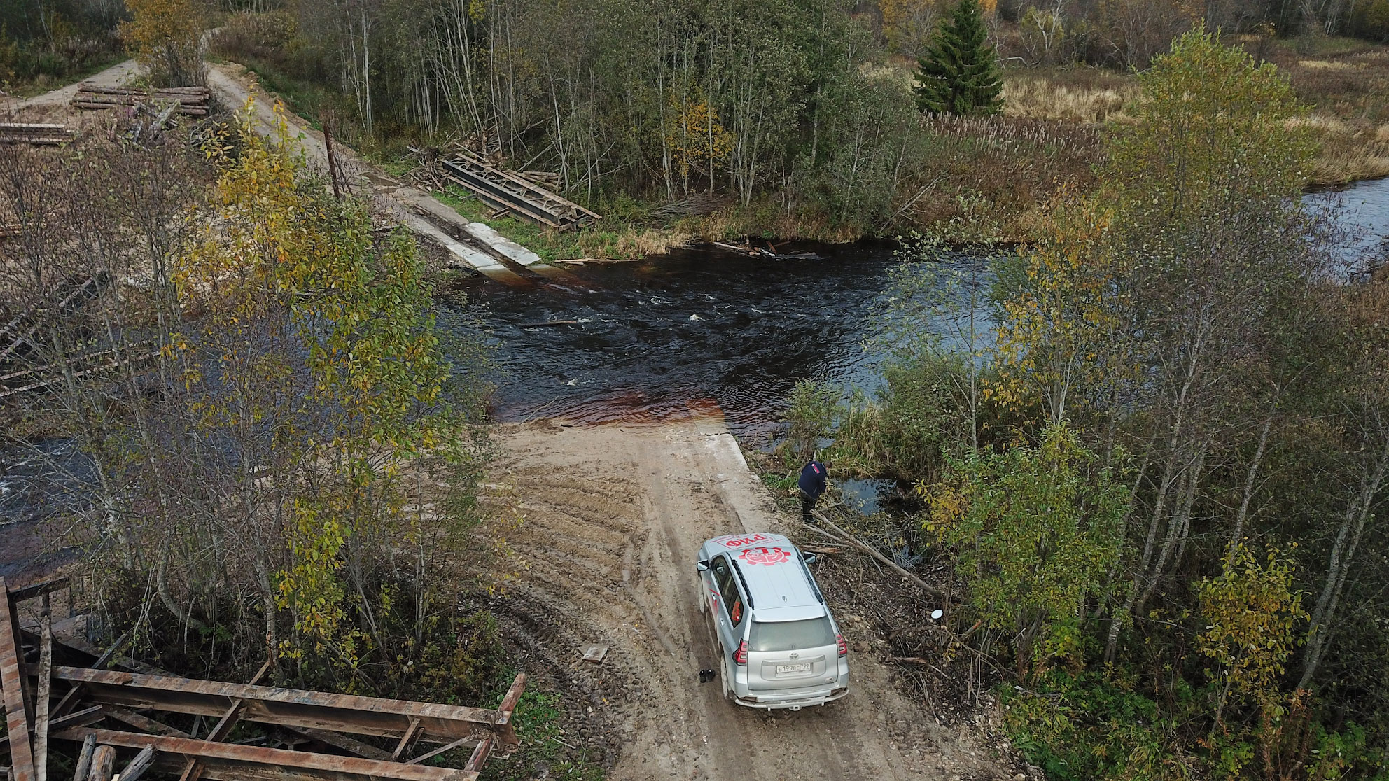We later learned that the bridge had been destroyed by a heavy truck that decided to drive along the road marked on the map, not expecting this road to quickly turn into a forest trail and a very old bridge. But now this bridge is being repaired in order to somehow maintain a connection with the other bank, upon which residential settlements are located.