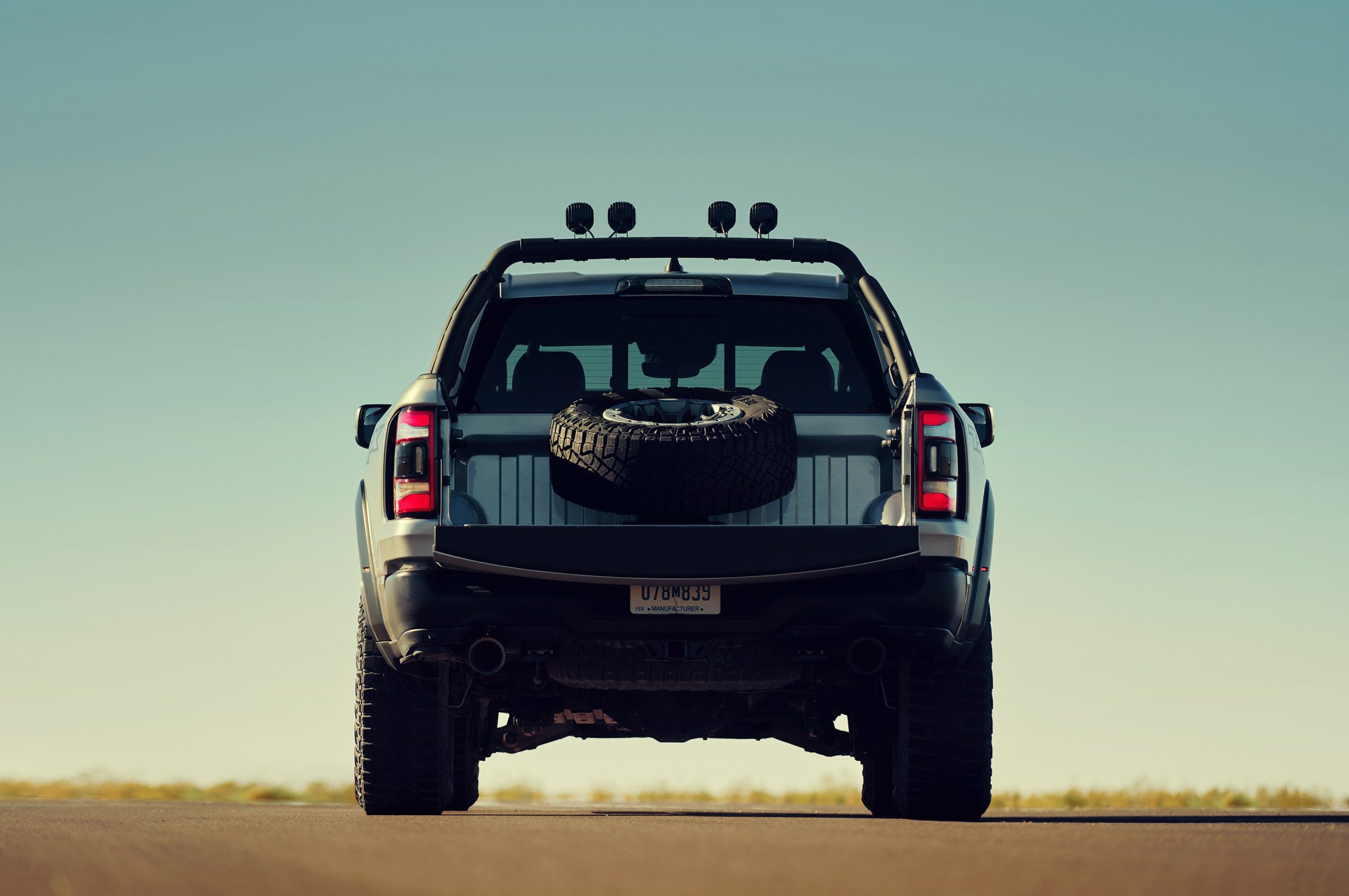 Ram TRX features new box outers made of steel and are wider than that of a traditional Ram 1500. A bed-mounted spare tire carrier is available in addition to the standard full-size spare tire that sits underneath the bed, between the rear axle and trailer hitch. Premium LED taillamps are standard on TRX and the bezels allow for the Blind-spot Monitoring function to see around the extended box outers.