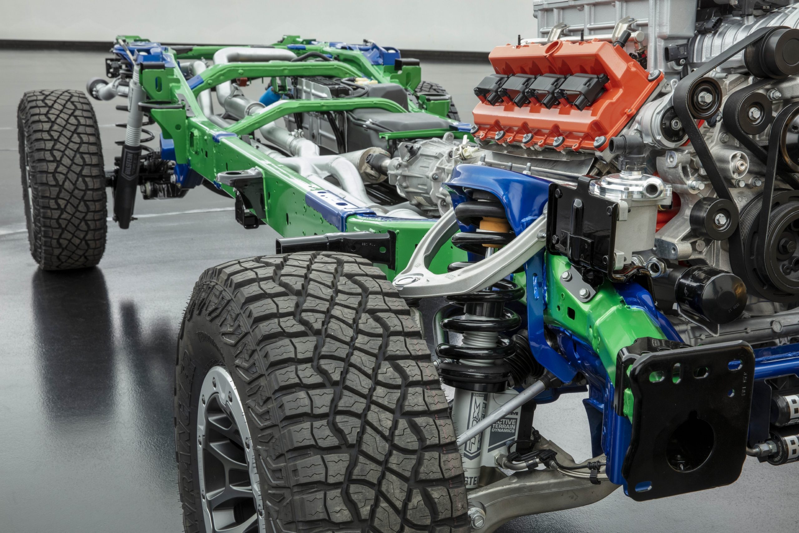 The front axle was shifted 20 millimeters forward to accommodate the 35-inch Goodyear Territory All-Terrain tires that were designed exclusively for TRX. The 35-inch tires are available with 18-inch beadlock-ready wheels with accent color-matched rings.