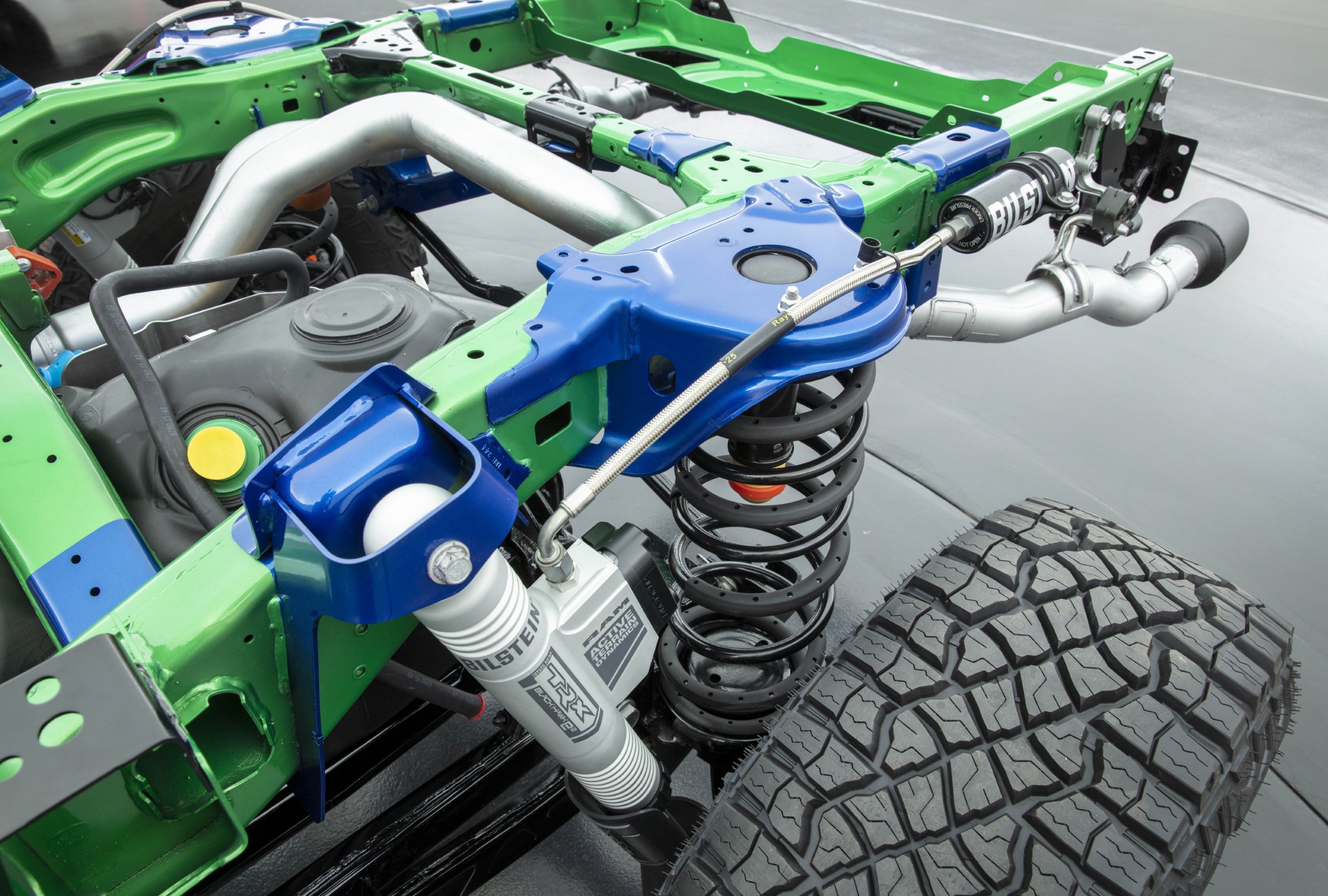 - Designed exclusively for TRX, new front and rear 2.5-inch Bilstein Black Hawk e2 adaptive performance shocks provide fast reaction time, unbeatable damping and improved heat dissipation for traversing harsh terrain at speeds greater than 100 mph