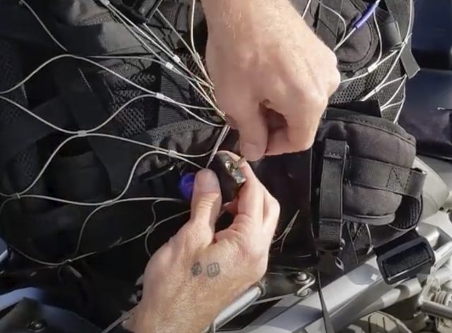 The locking mechanism can be user-error faulty. Make sure you’re synching the net as tight as possible, or someone can pull a jacket or even the duffel bag out. You’ll also want to make sure the opening is under the protector, and the longer cable used to fasten the net to the bike is woven through that, synched and locked to something that isn’t easily removable. Your bike’s frame is pretty much the only place I’d recommend. Even luggage racks can be removed with the right tools or sawed into.