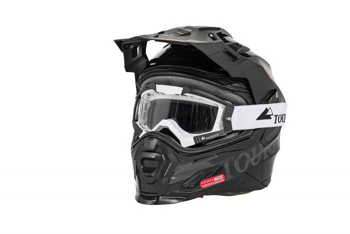 - Helmet with extendable peak, chin skirt, and pinlock visor