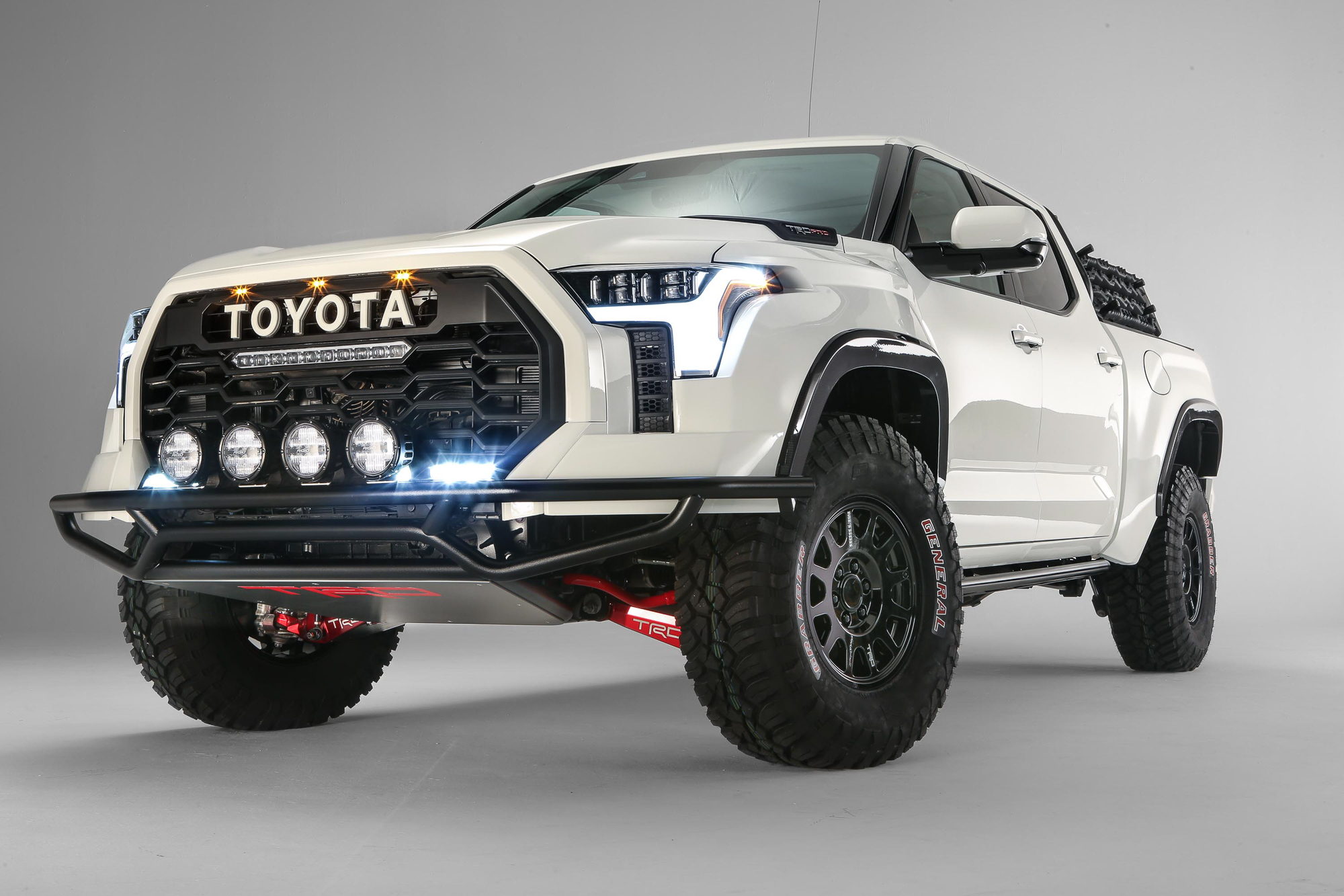 Based on the 2022 Tundra TRD pro, the Toyota Motorsports Garage team added a TRD-designed long-travel suspension as the foundation for this TRD Desert Chase Tundra. Carbon-fiber fenders and bedsides match the 4 inches of additional track width. By using OEM ball joints and stock bushings, the TRD long-travel increases performance while eliminating squeaks and maintenance. Extended-length internal bypass Fox shocks are tuned to TRD specs.