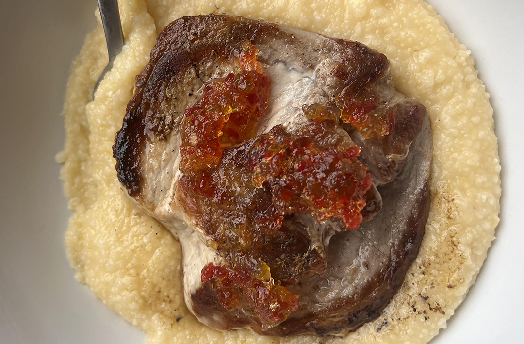 Use the wok to slow cook thick-cut pork chops at a low flame, about an inch over the lava rocks. Once they have reached an internal cooking temperature of 170°, remove and place them on the bed of cheese grits. Top with red pepper jelly.