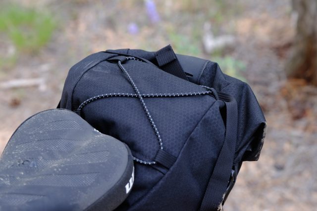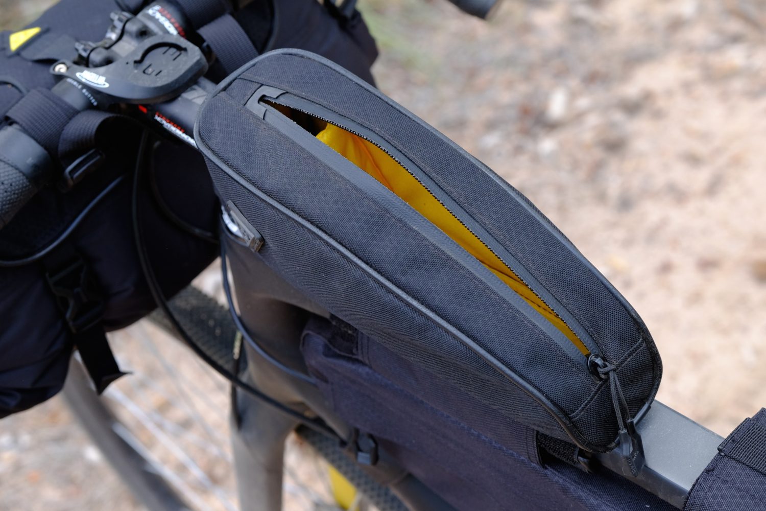 Although bikepacking bags are a relatively new thing, Topeak followed well-proven design trends, particularly with the frame and seat bags. The Backloader uses the roll-top closure and three-point attachment system favored by most bag makers, and the frame bag features robust velcro straps and dual-sided access zippers. For those of us who like to portage our feather-filled goodies in the seat bag, the Backloader is sold with a waterproof liner sack, which also makes unloading the bag an easy one-grab effort.