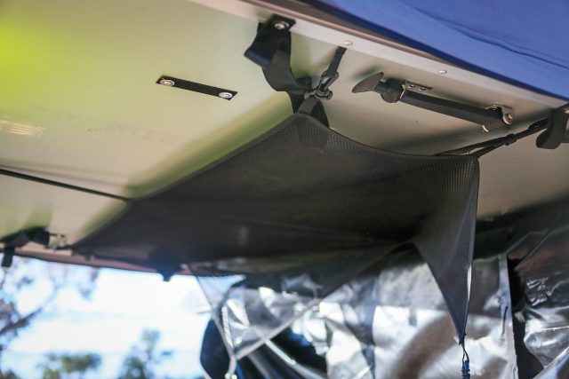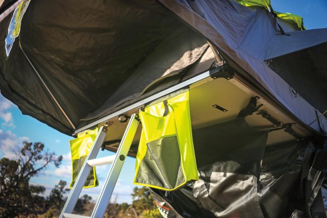 The Tamarack has a full-length rainfly that employs two PVC, frost-proof skylights. For my first attempt, setup took about 10 minutes, with extra time needed for fitting the annex hoop and pegging the support lines. On my G-Wagen, the ladder was a few inches short, so it is important to match the vehicle height, but most typical trucks or wagons will be fine. One feature I particularly liked about the Constellation is the wider hinges, which permit keeping most bedding in the tent. This greatly improves convenience and reduces storage space requirements in the SUV. I also found the 2.5-inch mattress to be comfortable, especially as a side sleeper. Personal design touches abound, with everything from rubber latches to hold fishing rods in camp to shoe bags that hang just below the door. The travel cover uses a zipper to provide a dust-resistant seal, but it can be time-consuming to zip on a tall vehicle. The tent is made from 380g poly/cotton ripstop canvas that has a water-resistant PU coating and is both fire and mold/mildew resistant.