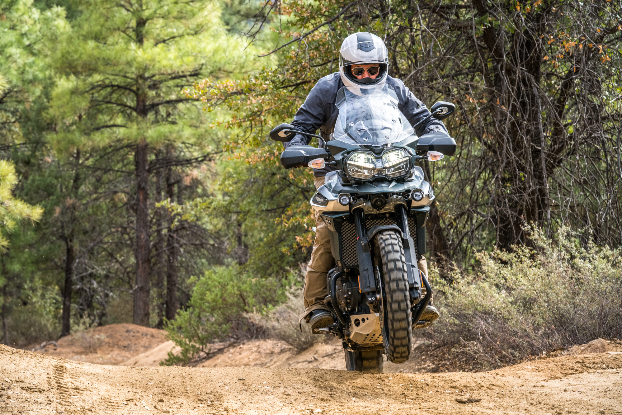 The big adventure bikes are getting so much better in the dirt, and the 1200 Tiger XCA is no exception. The previous model worked well for gravel roads and moderate conditions, but the new XCA variant is truly a GS and KTM fighter. The WP suspension has 7.48 inches of suspension travel (7.6 rear) and the benefit of extensive valving and spring-rate adjustments. The Tiger no longer bottoms easy and generally stays securely planted, even in technical terrain. We exposed the model to rocks, ruts, water bars, low traction DG, and deep water crossings. The new rider modes allow for Off-Road and Off-Road Pro, which calibrates wheelspin control via traction control and braking ABS. I found both to work well and you can still go full manual and turn everything off. Our test model had aggressive Pirelli Scorpion knobbies front and rear, which also aided in the tractability and lateral grip on the dirt. Other items of note are the full-size aluminum pegs, factory skid plate, and crash bars. The XCA is also 22 pounds lighter than the outgoing model, and the controls provide better modulation and a lighter overall feel.
