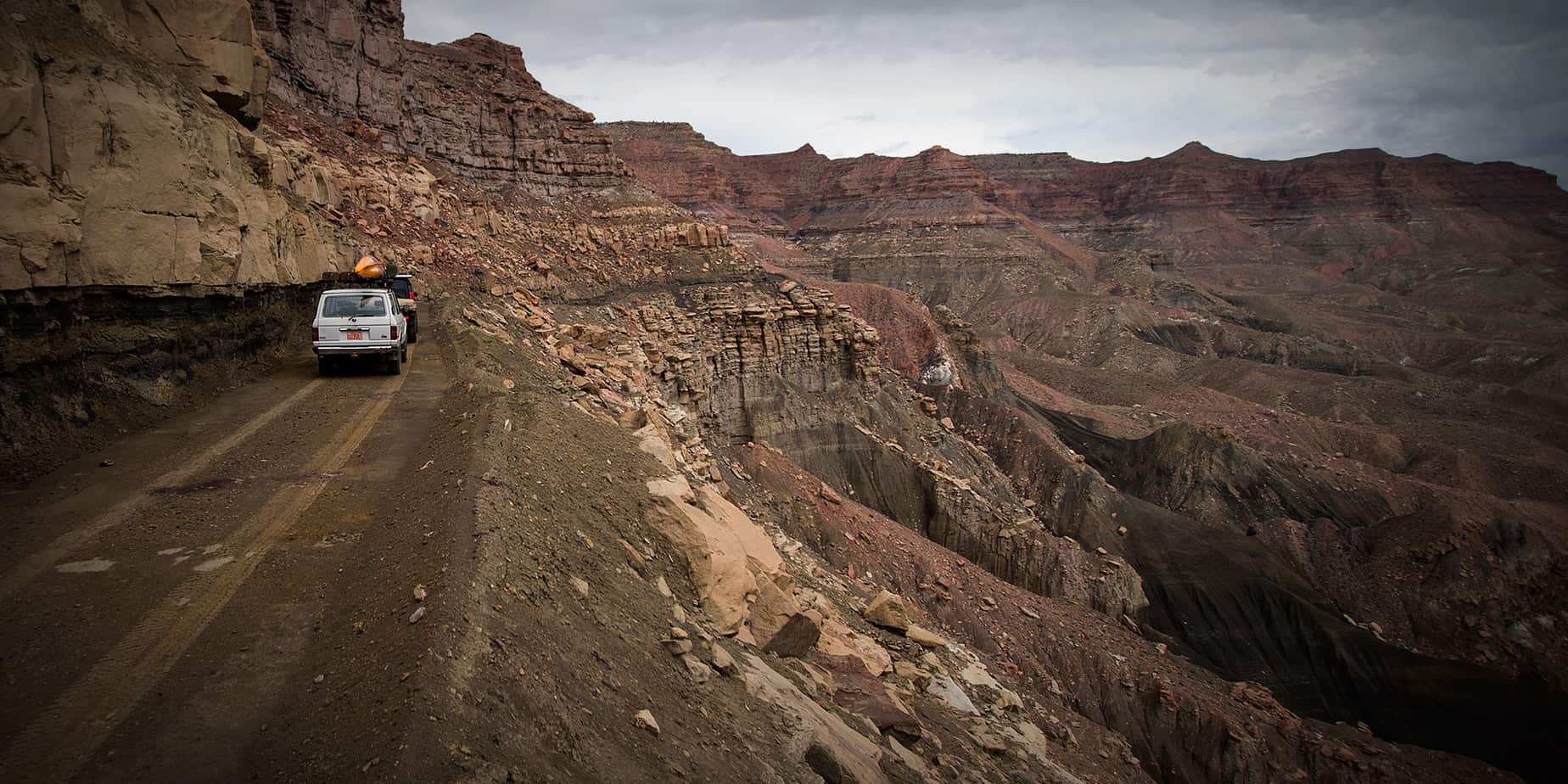 Ignoring the signs warning us of road closures and impending doom, we turned south to follow Pleasant Creek in hopes of winding our way up the massive form of Boulder Mountain in the distance. The first water crossing was little more than a trickle and a fun off-camber exit this time of year—while Google Maps will send you over Lippincott Pass in a Camry without a second thought, the slightest hint of water is enough to shut down it’s routing. The wonderfully sinus-clearing scent of fresh sage filled the truck as we twisted through a maze of brush, up the narrow wash, and over the rocky ledge that makes up South Draw.