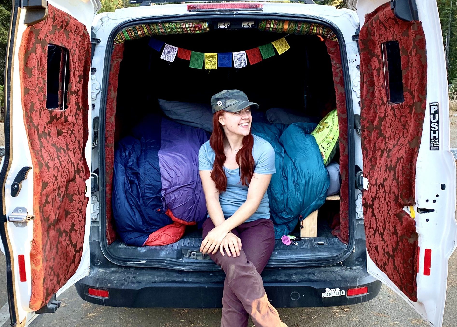 The shift to van living has, of course, been an adjustment. “There’s a lot of dragging your stuff around,” she observes. “Everything lives in the van. I throw all of my things into my tote and head to the showers. When I stay with friends, I have to switch clothes—there’s more to it than simply washing. I organize them by suitcases: warm clothes in one, lighter wear in another. You relinquish a lot of creature comforts, but what you gain is the opportunity to travel and have experiences with people. I’m young enough that I can do this.”