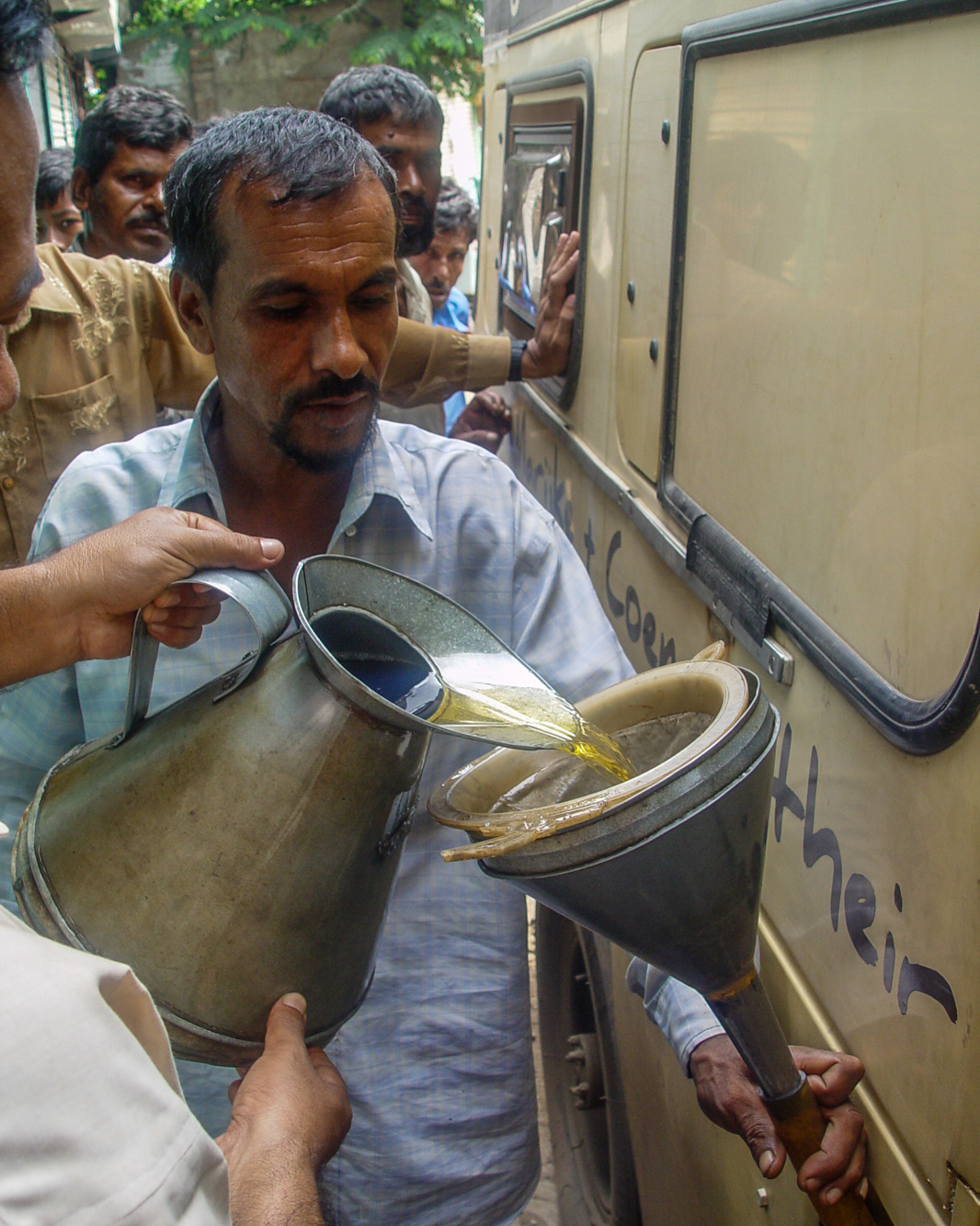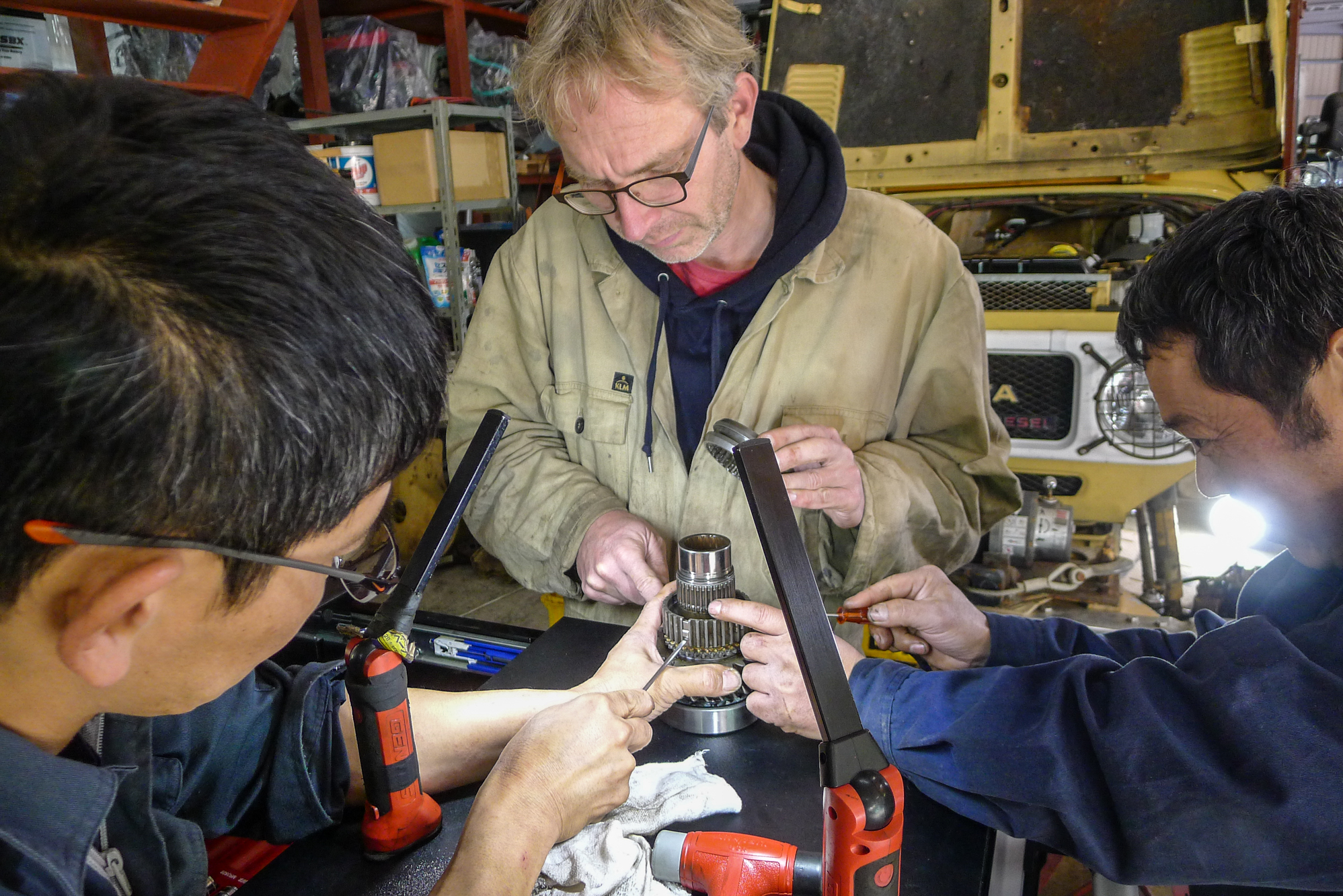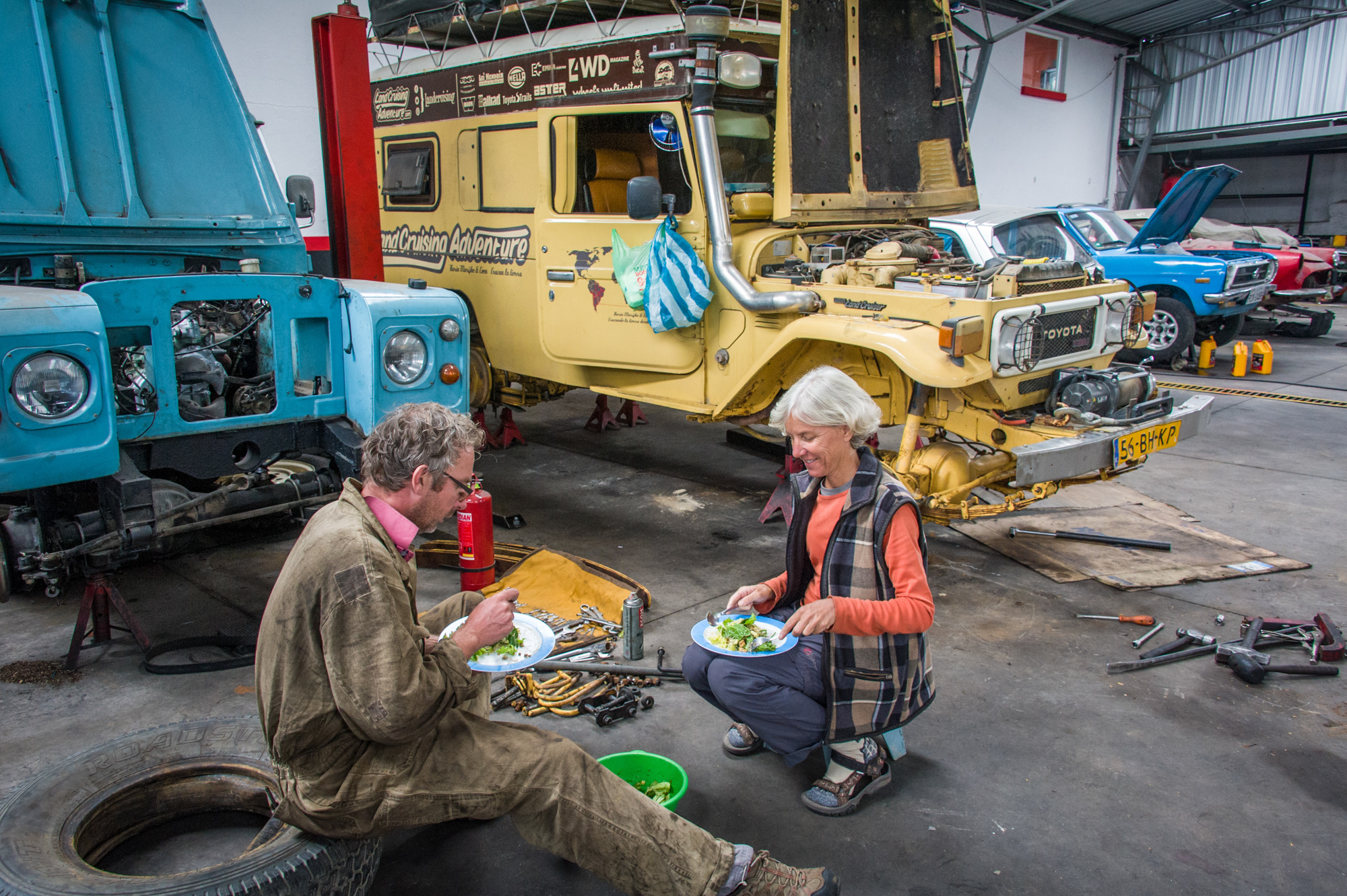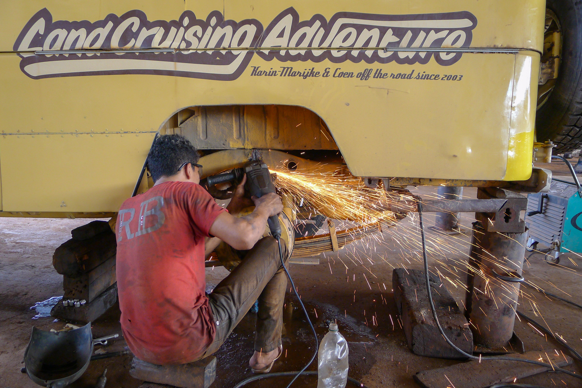 Coen’s worries mostly occur before the actual repair takes place, with questions running amok in his head, “How are we going to fix this? Where will we find people who can help us?” Once in the workshop and having changed into his overalls, Coen quickly enjoys himself. He learns from the mechanics who help him, and in return, lends them a hand when needed. Mechanics may take him for lunch or the day ends with a barbecue. Sometimes the work takes longer than a day and we camp in workshops. A Toyota dealer in India gave us the keys to the showroom so we could watch TV in the evening among brand-new Prados. In Bogotá, we could not leave or enter the workshop after 10:00 p.m. because the alarm was set, while in Quito, the alarm was supposed to be off but wasn’t. When we walked to a sink to brush our teeth we were scared out of our wits by the noise when the alarm went off. Camping in workshops has given us unique adventures.