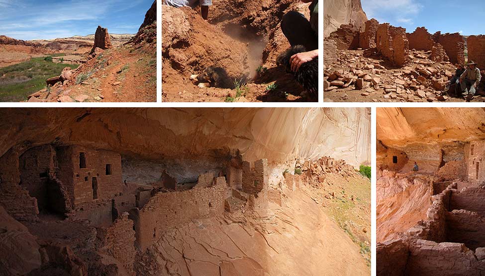 The open desert faired far worse through a harsh winter than the mountains and canyons we had visited thus far, and all trace of the tiny two-track trails leading to our destination had faded from existence. While wandering through the sand in search of a route, adorable twin puppies came bounding up out of nowhere—after a few miles our guide finally gave in to their cuteness and adopted them. Cautiously we made our way down the cliffs of Tséyík’áán (Comb Ridge), breaking ground on a new trail to reach the valley floor.