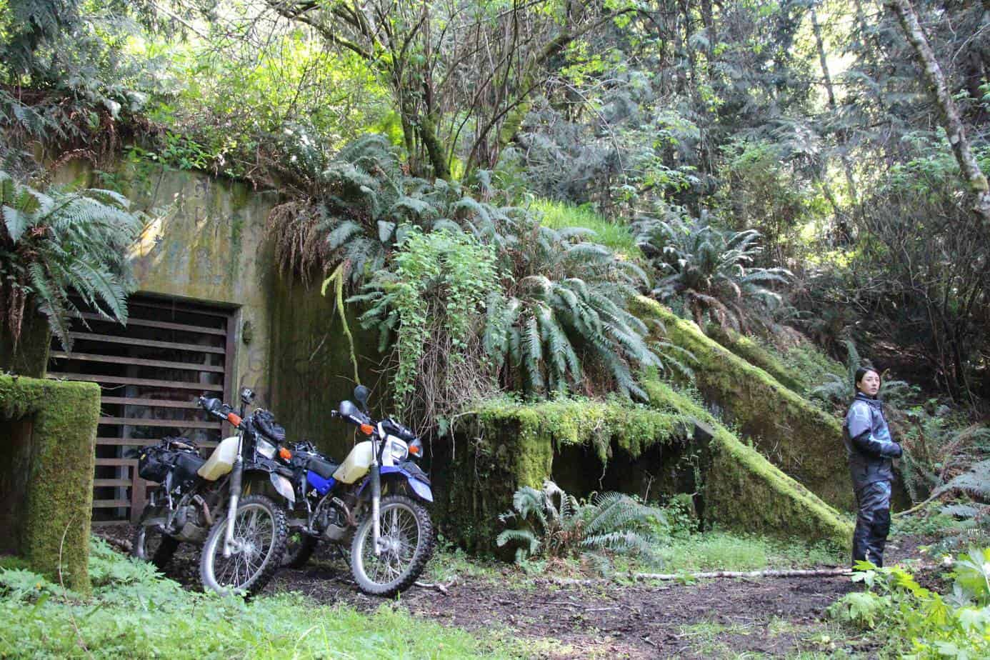 An hour later we hopped aboard our bikes and headed west. Washington’s Highway 114 runs parallel to the Strait of Juan de Fuca, swinging on and off the coastline as it travels from Port Angeles to Neah Bay. I’ve driven this road countless time while searching for surf, and almost always notice an assortment of two-track spur roads that lead south into the woods. In our van, however, these seem impassable. But on bikes… Well, that’s what we came here for! The first road we turned down went from rough pavement to loose gravel, and lead us through a small neighborhood of houses. No more than five minutes later and we were surrounded by tall pine trees. The gravel road swayed left and right and then headed uphill. Save for Kyra’s small spill courtesy of a rather large rut, our race to the first of many abandoned military bunkers was otherwise accident and event free.