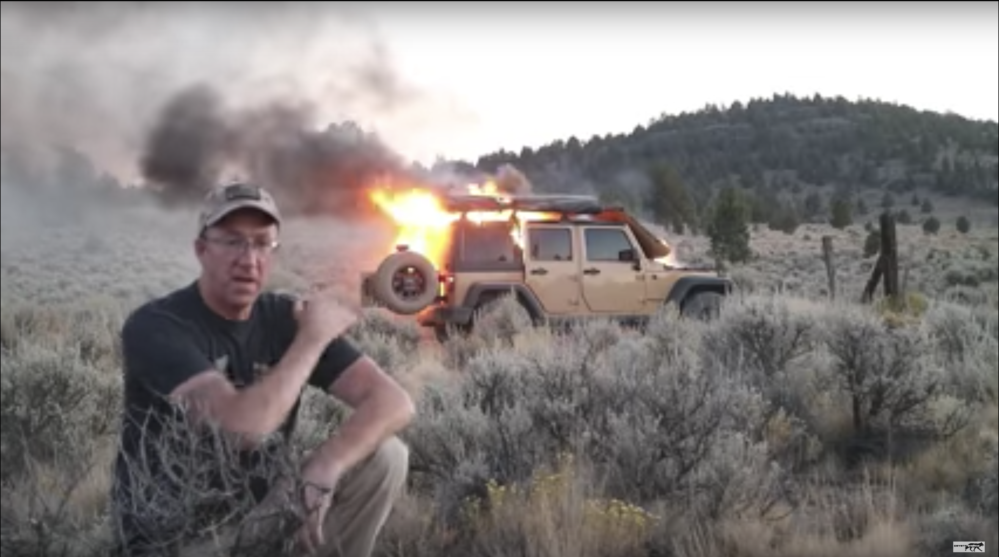 On September 16, an overland YouTube channel called Coyote Works published a video titled Jeep Wrangler Catches Fire & Burns—Overland Car Camping Trip Ends in Disaster. As you can imagine, it generated a bit of a stir. The video begins innocently enough with the owner, Casey Kaiser, on a jaunt through the Oregon desert while describing the area around him. Later in the day, he stops to open a gate, at which time smoke begins to pour out from under the Jeep’s hood. Unfortunately, there is no video of the next few moments, but Casey claims that he used both the fire extinguisher and several jugs of water attempting to put out the flames. Whatever he did, the efforts were unsuccessful, and the flames returned strong as ever. The remainder of the video is somewhere between odd and depressing, as you watch his JK burn to the ground while he calmly talks through the situation like it’s a training video.