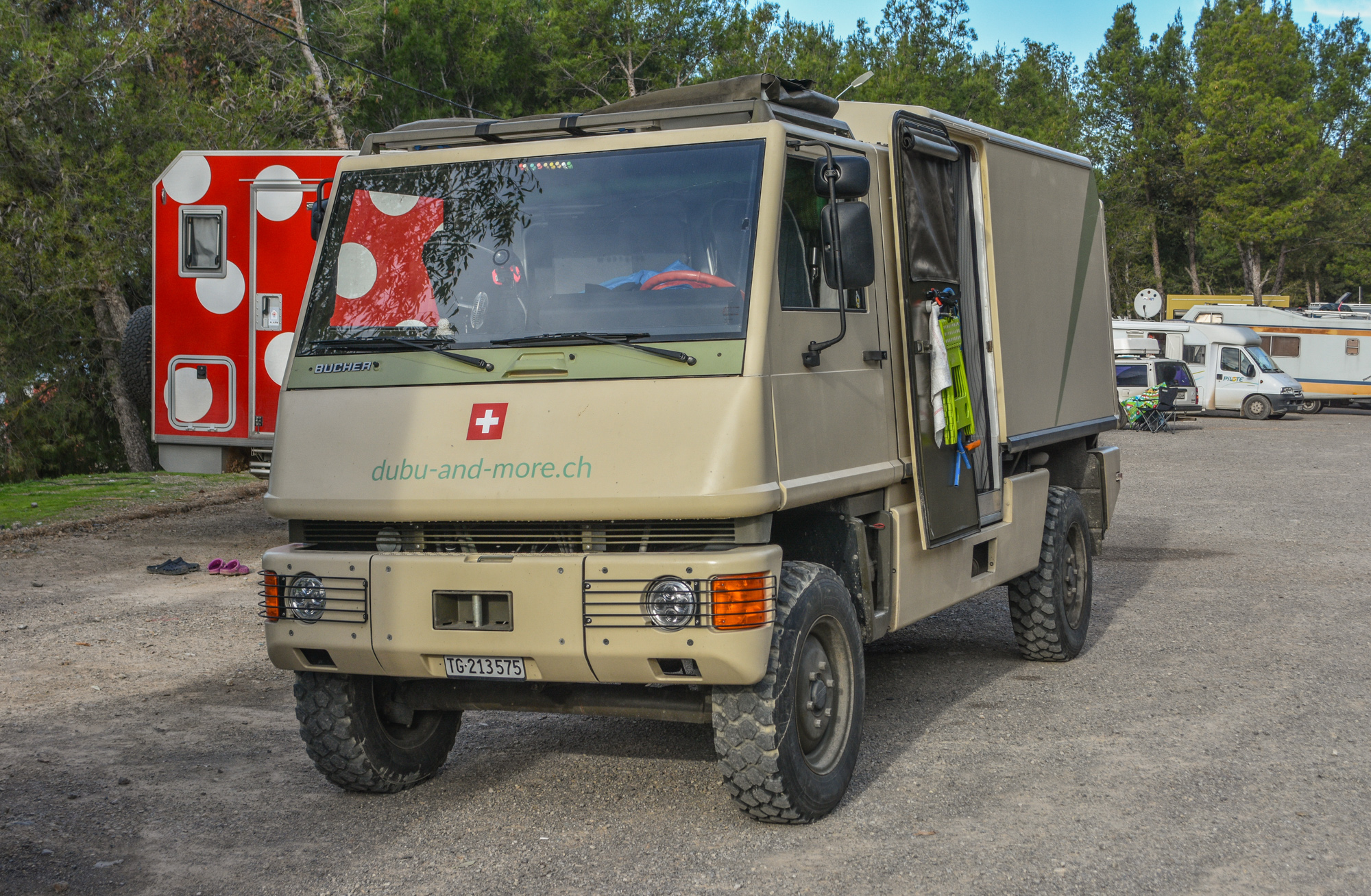 The next morning after a spectacular spectacle, a cup of coffee and a fried egg sandwich we packed the Defender and drove back towards the main road to find that the white truck had eventually found a place to camp and was accompanied by a 4×4 van which also bore Swiss license plates. We introduced ourselves and soon learned that the white camper truck was called a T-Rex (made by Gremel) which though large was light enough to be driven on a normal European license, that the couple in the truck had been overlanding since the 70’s and that the 4×4 van belonged to their son who had been out of the Swiss military long enough to grow a man bun. They had recently crossed into Turkey from Iran where they lamented the modernization of the country. The T Rex was perhaps their tenth overland vehicle – they had owned and travelled in everything from small French sedans to Defenders, Land Cruisers, Pinzgauers, Unimogs, MAN trucks and motorbikes. They declared the T-Rex to be the best of them all. But, this article is not about the truck, it is about the people (the photos are more about the trucks, because we know you all love some good old fashioned truck porn).