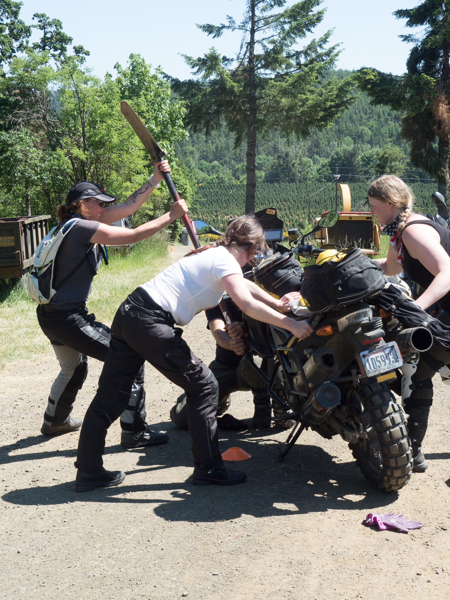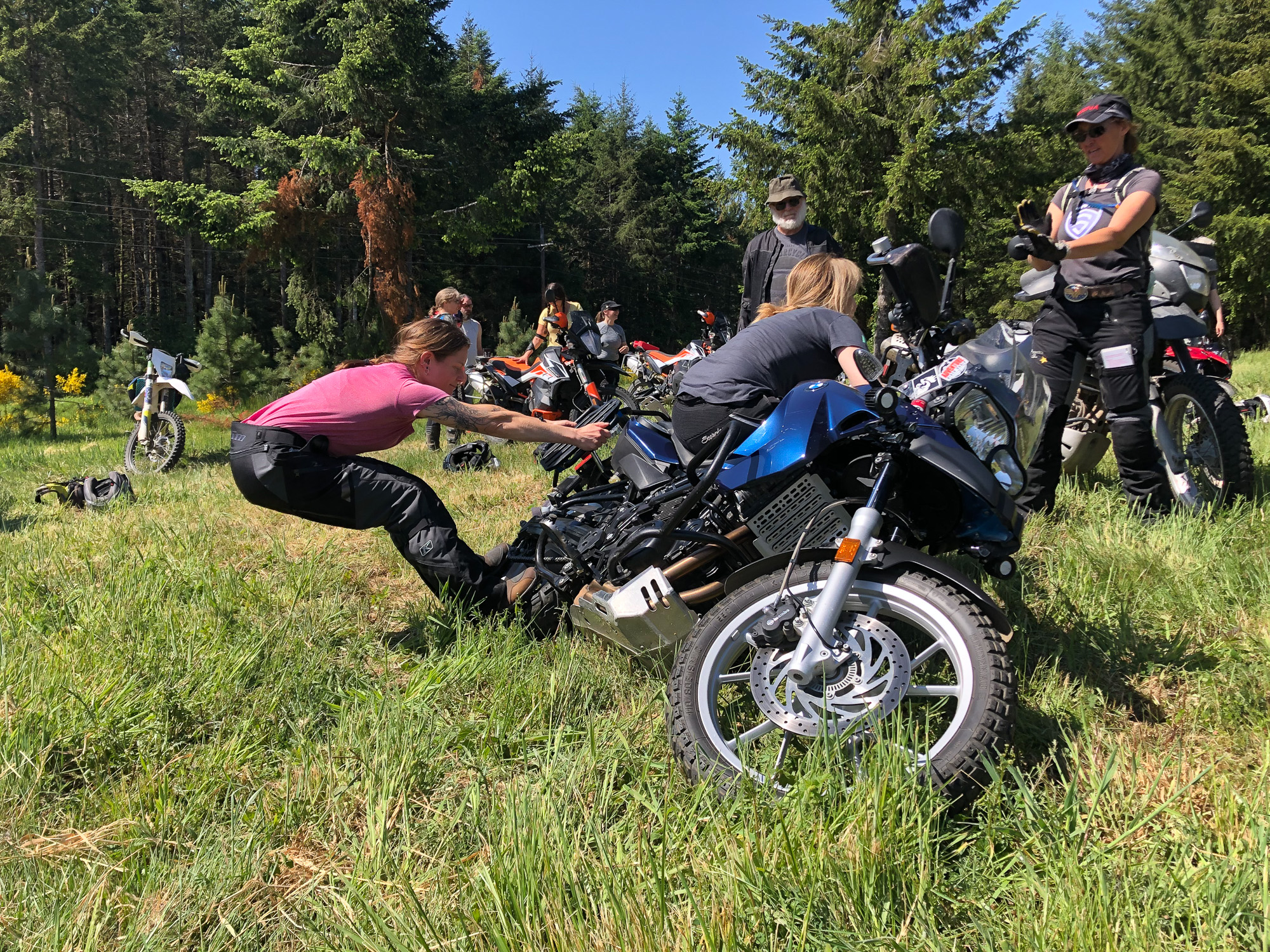 These exercises and others were for discovering the balancing point of our bikes and how to gain control in nonideal circumstances. Flicking up kickstands, we were asked to take one finger—two at most—to balance the bike while walking in a circle. A few bikes toppled over, giving us opportunities to try out the Monkey Lift, where one person grabs the handlebars and frame or rack, shoving their butt into the seat. Another gets hold of the frame or rack on the other side, stands on the rear wheel, then sits, cantilevering. This was a valuable skill for me to learn; although the Monkey Lift requires two people, I could now have a more active role in lifting my bike. Plus, the two-person technique would save energy if I was out with my husband or another riding partner where bike drops might be common. I’m able to pick up my GS, even fully loaded, but in terrain where the bike might go down more often, multiple solo re-rights were too exhausting.